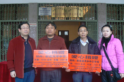 12月15日早上8点,由院团委、爱心社、社联联合举办的为新化山区金凤、太平两所中学捐衣物活动出发仪式在理科楼前坪隆重举行。物理与信息工程系党总支副书记谢常清、院团委副书记谢柳出席了捐赠出发仪式。