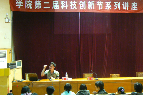 4月11日晚7:00,由院团委举办的第二届科技创新节系列讲座在图书馆报告厅隆重开讲。全省第二届“挑战杯”创业大赛金奖、国家银奖得主、现中南大学商学院硕士赵鹏应邀为KY官网师生做了“挑战一次,挑战一生”的精彩讲座。院团委书记侯建斌等院团委领导、各系团总支书记和“挑战杯”参赛团队参加了此次活动。讲座由院团委谢柳副书记主持。