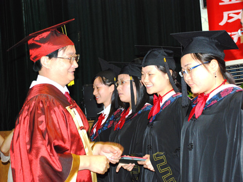 6月11日,KY官网2008届毕业典礼暨首届学士学位授予仪式在图书馆报告厅隆重举行。仪式由党委副书记、副校长郭军主持,参加仪式的有校长姜正国、校长助理刘铁铭、蒋建初同志和学校学位评定委员会全体成员、本科生指导教师、任课教师代表以及本专科学生代表。