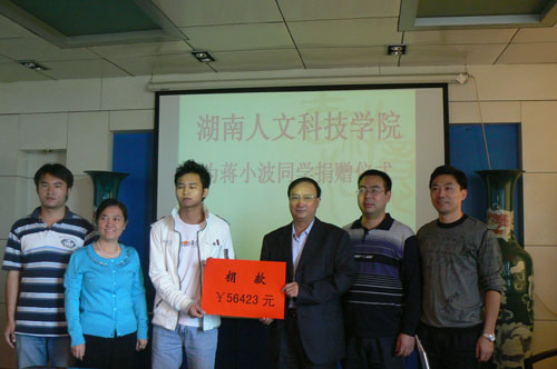 10月16日,学校在第一会议室举行了捐赠仪式。仪式上,校党委书记姜正国、副院级督导员李凤莲以及团委主要负责人将在全校募集到得56423元捐款转交给了物理系党总支副书记刘辉以及蒋小波所在班级的学生代表。