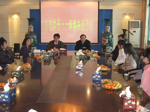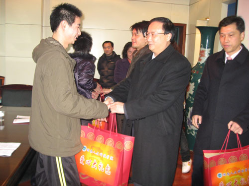 各位校领导与留校的32名贫困生代表进行了亲切座谈。校领导详细询问了同学们留校的生活、学习情况,耐心听取了他们留校期间亟待解决的困难,姜正国同志进行了认真的答复。同时,每位同学都受到了学校发给他们的“爱心大礼包”。