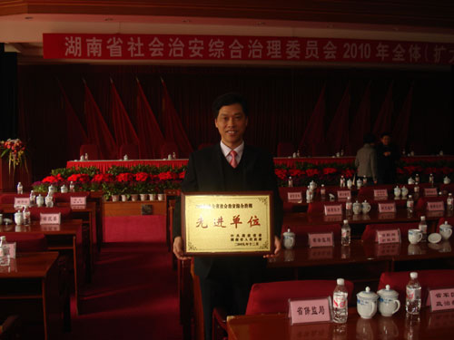 2月24日,在省社会治安综合治理委员会2010年全体(扩大)会议上,KY官网被评为2009年度省直和中央驻湘单位社会治安综合治理先进单位。图为KY官网刘铁铭副校长代表学校参会并领取奖牌。