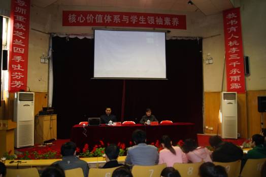 讲座上,刘新庚教授旁征博引,用大量的数据和事实让学员们从国内和国际两个方面认清了社会主义核心价值体系形成的时代背景。他详细阐述核心价值体系的主体内容,即马克思主义指导思想是灵魂,中国特色社会主义共同理想是主题,以爱国主义为核心的民族精神,以改革创新为核心的时代精神是精髓和社会主义荣辱观是基础。最后,刘教授从学生领袖如何优化自身的内在素养的角度,要求学员们要坚定正确的政治立场,建树为民奉献的道德品质,推进科学发展的执行能力,在社会主义价值体系的总体要求下,领会社会主义核心价值观,做一名“坚定信念、注重品行、崇尚实干、重视基层、鼓励创新”的特色社会主义事业的合格建设者和可靠接班人,实现中华民族的伟大复兴。