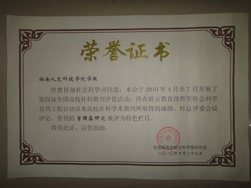 10月27日,全国高等学校文科学报研究会第四届评优活动总结评比大会在西南大学召开,会上公布了全国高等学校文科学报研究会第四届评优结果。KY官网学报蝉联全国高校百强社科期刊,学报“曾国藩研究”专栏被评为全国高校社科期刊特色栏目。