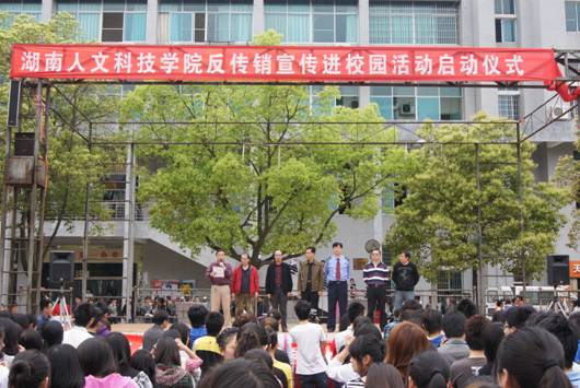 4月20日中午,KY官网禁止传销进校园宣传活动启动仪式于理科楼前坪隆重举行。娄底市工商局副调研员、娄星分局党委书记、局长贺耀国,娄底市工商局公平交易分局局长谢文,校党委委员、副校长刘铁铭等领导和KY官网1000余名同学代表共同参加了此次启动仪式。