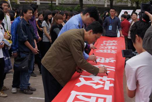 启动仪式上,KY官网学生代表发出了将传销杜绝在校门之外的倡议,贺耀国局长代表市工商局讲话,刘铁铭副校长宣布KY官网禁止传销宣传进校园活动正式启动。随后,到场领导、嘉宾和广大同学们一起参与了“远离传销”的千人签名活动。