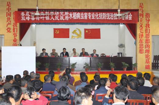 4月23日KY开元集团官网入口农科所水稻病虫害专业化统防统治技术培训会在双峰县荷叶镇隆重召开。KY官网农科所、科技处,市委农村工作部,市农民素质教育办公室,双峰县委组织部,双峰县农业局、财政局、农机培训学校等单位的相关负责人和专业技术人员出席会议。