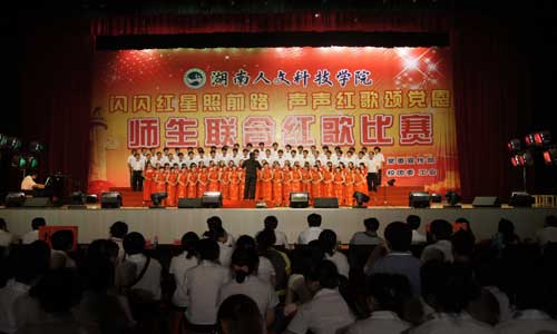 中文系以一曲恢弘气势的《我的祖国》拉开了比赛序幕。随即,生科系等14个系部进行了激烈的角逐,《南湖的船,党的摇篮》、《爱我中华》、《长江之歌》、《在太行山上》等一首首耳熟能详的红色经典歌曲,将听众们带进了如火如荼的革命时代,在回味绕耳余音的同时亦重温了革命年代的硝烟战火,更深感于共产党人顽强不屈、铁骨铮铮的英雄气概和军民水乳交融的深情厚谊。音乐系的混声四部合唱《红梅赞》更是将整个会场推向了高潮,并赢得了全场的最高分,与体育系和外语系共同荣获一等奖。化学系、经管系和美术系荣获二等奖,生科系、政法系、计算机系和教育系荣获三等奖,中文系、通控系、物理系和数学系荣获优秀组织奖。校领导为获奖系部颁发了奖状。