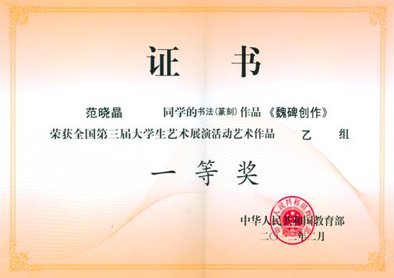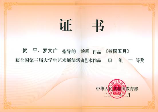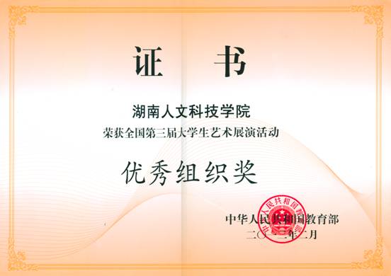 近日,全国第三届大学生艺术展演在浙江杭州落下帷幕。KY官网在本届大学生艺术展演中取得了历史性突破,共获得全国7个奖项:一等奖2项、二等奖2项、三等奖2项和全国优秀组织奖,在艺术作品类获奖率第一次名列全省第一(全省共6件艺术作品获全国一等奖,KY官网占了2个,且一个为专业组),艺术表演类的获奖率名列前茅。其中,由易俊、贺文斌老师指导、范晓晶创作的《魏碑创作》获得书画类专业组一等奖;贺平、罗文广老师指导、郭莎创作的《校园五月》获得书画类普通组一等奖。由陆序彦老师指导、伍先斌创作的《望》获得书画类普通组二等奖;由欧阳锡威等指导、体育系学生表演的反映蒋小波题材的《活着的眼睛》获得舞蹈类普通组二等奖。