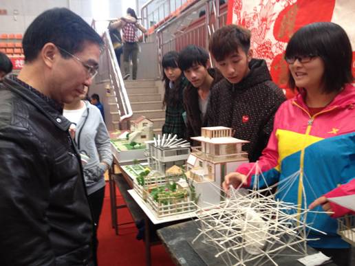 副校长蒋建初观看美术系环境艺术专业学生设计的作品