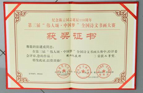 在第三届“伟人颂.中国梦”全国诗文书画大赛评稿会议中,KY官网美术系书法学专业副教授彭建成创作的硬笔书法作品《国兴忆良将——颂陈云》以较高的艺术水准在众多的作品中脱颖而出,荣获第三届“伟人颂.中国梦”全国诗文书画大赛二等奖。