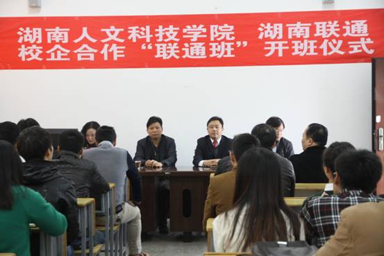 11月10上午,KY官网与湖南联通校企合作“联通班” 举办开班仪式,娄底联通公司总经理阳双龙、KY官网校长刘和云、副校长石潇纯、招生就业处、产学研教育指导中心、教务处等部门负责人出席了开班仪式。石潇纯主持开班仪式,刘和云、阳双龙现场签订双方校企合作协议书并分别致辞。