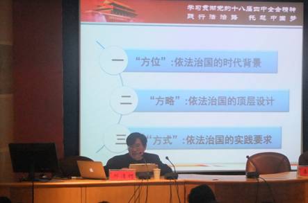 报告的主题是《学习贯彻党的十八届四中全会精神——践行法治路,托起中国梦》。邓处长从方位、方略和方式三个方面为大家作了精辟讲解。他首先介绍了十八届四中全会制定依法治国方略的时代背景。他说,我国正处于经济发展驶入快车道后的“平稳减速期”、改革走向深水区的“重要出发期”、社会深刻转型的“价值磨合期”和反腐高压态势下法纪对接的“机会窗口期”,因此,党的十八大以来中央提出的全面建成小康社会、全面深化改革和全面推进依法治国符合党情、国情和民情。在解读“方略”时,他指出,这是依法治国的顶层设计。他认为,全会鲜明提出坚定不移走中国特色社会主义法治道路的总要求、全面推进依法治国的总目标以及坚持两个“三位一体”的总思路,从不同角度深刻回答了如何全面推进依法治国的问题。在谈及“方式”时,他从法治设计、法治规定、法治实施、法治适用、法治司行、法治遵守六个角度具体阐述了依法治国的实践要求。最后,邓处长立足湖南改革与发展的实际,通过自己的思考,提出了依法治省、全面推进法治湖南建设的基本思路。