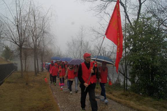 志愿者们冒雨开展“保卫母亲河”垃圾清理活动