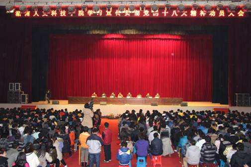 党委书记柏连阳作动员报告。他阐述了深入学习十八大精神的重大意义;要求广大教职工深入学习、全面准确把握十八大的精神实质;联系实际,努力办好人民满意的高等教育,当前及今后一个时期,要着力抓好十八大精神的学习、宣传和贯彻落实;还提出了学习宣传贯彻十八大精神的工作要求。