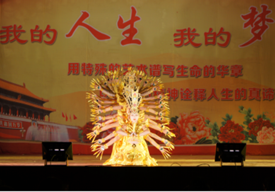 北京“心灵之声”残疾人艺术团是从1992年开始形成的中国第一支残疾人艺术团,他们旨在“用特殊的艺术谱写生命的华章,以不屈的精神诠释人生的真谛”,并在全国各地进行着感人至深的表演。在近两个多小时的演出中,有盲人演员表演的乐器合奏,有断臂演员演唱的励志歌曲,有独腿舞者表演的艺术舞蹈,有聋哑演员表演的《千手观音》。著名的残疾人书法家郝天增,以口代手、执笔挥毫,在现场写出了气势恢宏的“仁爱满园”四个字赠送给KY官网。李凤莲代表学校接下了这张特殊的书法作品。