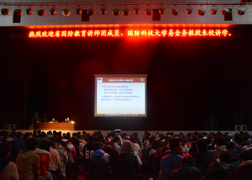 39日晚,省国防教育讲师团成员、国防科技大学教授易金务应邀以中国周边安全最新态势及对策为题,在学校体育馆作专题讲座。校军事爱好者协会、民兵信息分队、后勤勤务保障分队及来自各学院的2000余名学生参加讲座由校长助理谢贵辉主持。