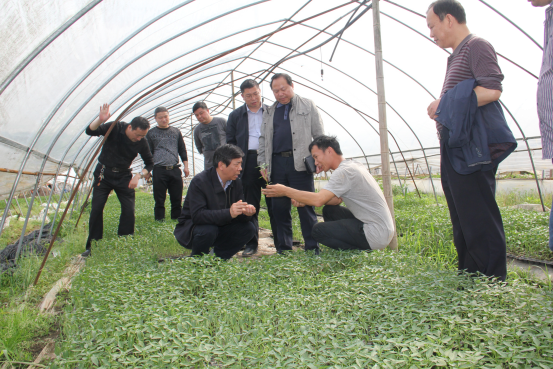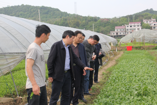 在洪山殿镇贤才果蔬专业合作社负责人曾贤才的引导下,郭军一行深入田间地头、果蔬大棚进行现场查看。当看到长势良好的辣椒秧苗时,郭军便仔细询问育苗方法、育苗程序及秧苗销售价格、销售范围、销售方式等情况,当了解到合作社仅2016年几个月就已经销售了70万株辣椒秧苗时,郭军连连竖起大拇指予以鼓励,并建议“销售必须更多依靠现代信息网络”。当看到郁郁葱葱的生菜、毛白菜等大棚时,郭军便向曾贤才了解生菜、毛白菜种植、施肥、喷药、销售情况。当看到种在露天田地里的小白菜有些叶子发黄时,曾贤才告诉郭军一行,“今年雨水太多,不利蔬菜生长”,郭军弯下身子,仔细查看后叮嘱旁边的康林峰:“老康,你是专家,你帮助他们好好诊断一下,除了天气原因,是否还有病虫害方面的因素。”在查看了近50多个蔬菜大棚和近50亩露天蔬菜后,郭军一行还对整个近1000亩面积的果蔬园的灌溉系统进行了查看。