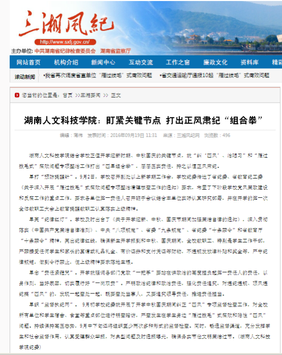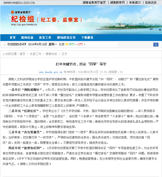 9月18日,学校廉政建设工作新闻稿《盯紧盯牢关键节点 打出正风肃纪“组合拳”》、《盯牢关键节点,抓实“四早”环节》分别被省纪委官网和省教育厅官网采用。