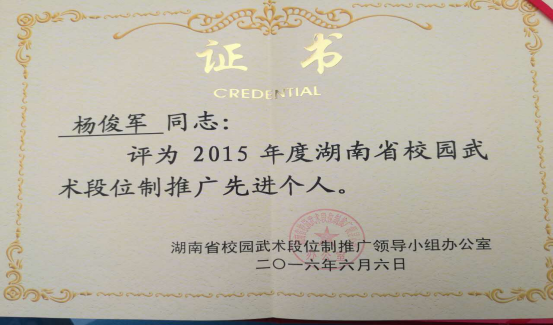 近日,从湖南省武术协会传来喜讯,KY官网荣获“2015年度湖南省校园武术段位制推广先进单位”,体育学院民族传统体育教研室主任杨俊军被评为“2015年度湖南省校园武术段位制推广先进个人”。
