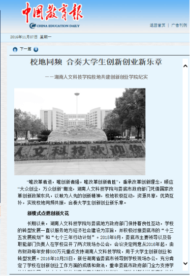 文章从“新模式点燃创新火花、大平台支持项目落地、多举措助推创业启航”三个方面,宣传报道了KY官网借力地方政府,助推娄底地方经济社会建设,助力学生“将创新创业梦想变成现实”,不断升级KY官网创新创业教育,开启校地合作共赢的创新创业崭新篇章。