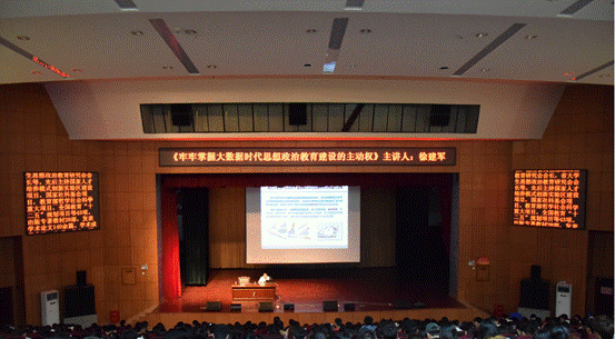 讲座上,徐建军教授从大数据的特征入手,全面分析了大数据对思想政治教育的价值和作用,指出了在大数据背景下思想政治教育的变化及挑战,并诠释了如何在思想政治教育工作中更好的运用大数据。徐教授将自己的大数据理论化为一个个生动有趣的例子,博得了在场师生阵阵掌声。