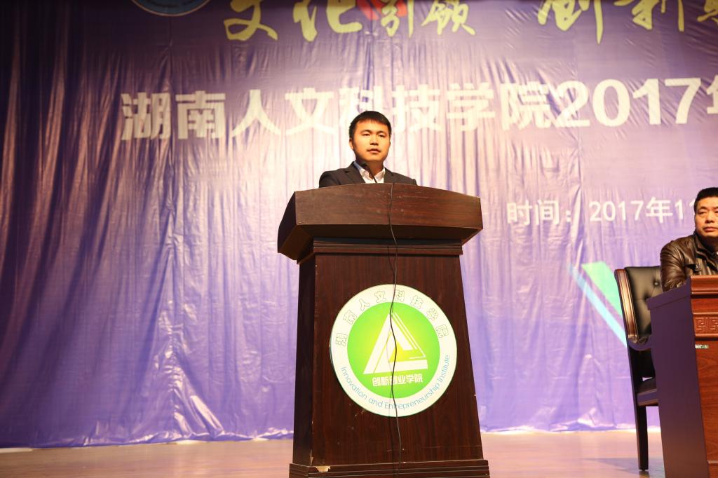 杨金含代表娄底市委、市政府对学校2017年度创新创业文化节的开幕表示热烈祝贺,他充分肯定了KY官网的创新创业教育工作以及对娄底经济社会发展做出的巨大贡献。他强调娄底市还会一如既往地支持学校的发展和学校的创新创业教育工作并希望KY官网的创新创业浪潮能与娄底市的创新创业浪潮同频共振,校地创新创业资源实现共享共赢,迸发出更大的生机与活力。
