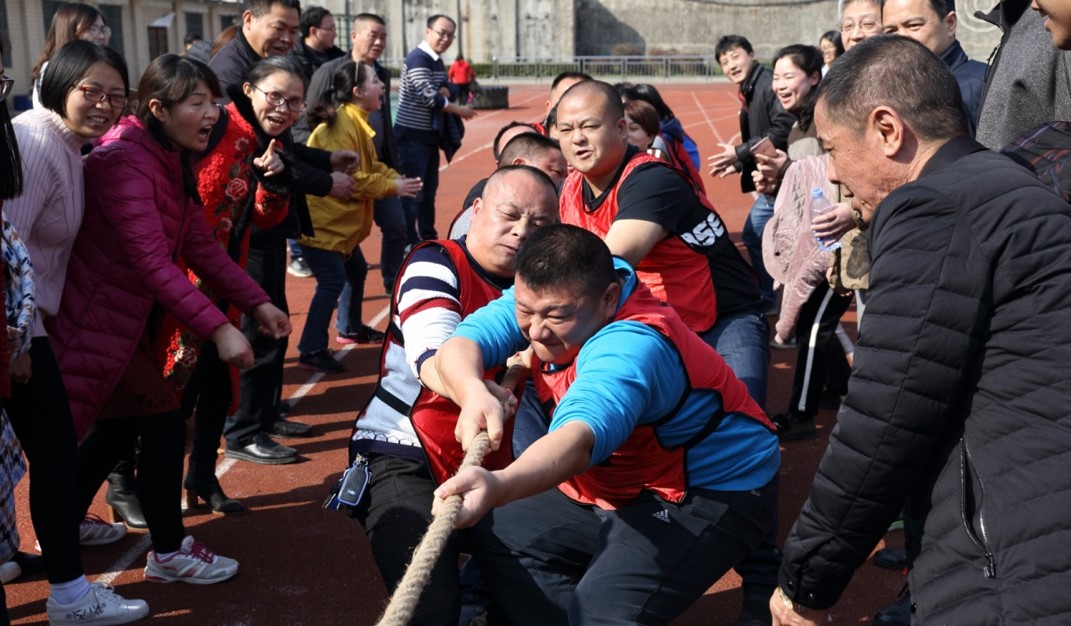 3月8日下午,春风和煦,阳光明媚。校田径运动场人声鼎沸、喜气洋洋,由校工会组织的庆“三八”国际劳动妇女节教职工拔河比赛在此举行。来自全校20个参赛队的领队、教练、运动员及裁判员共400多人参加了本次活动。