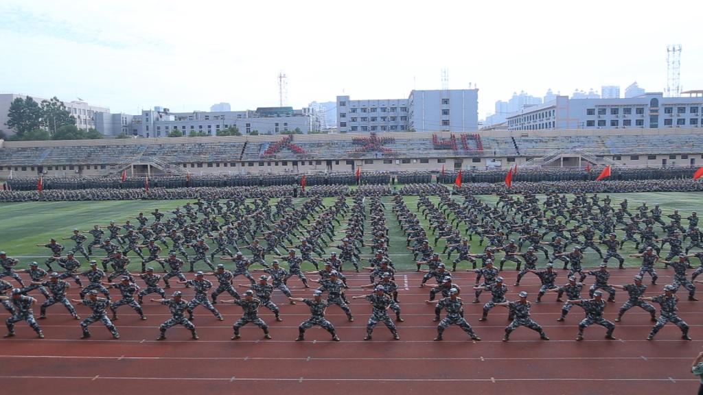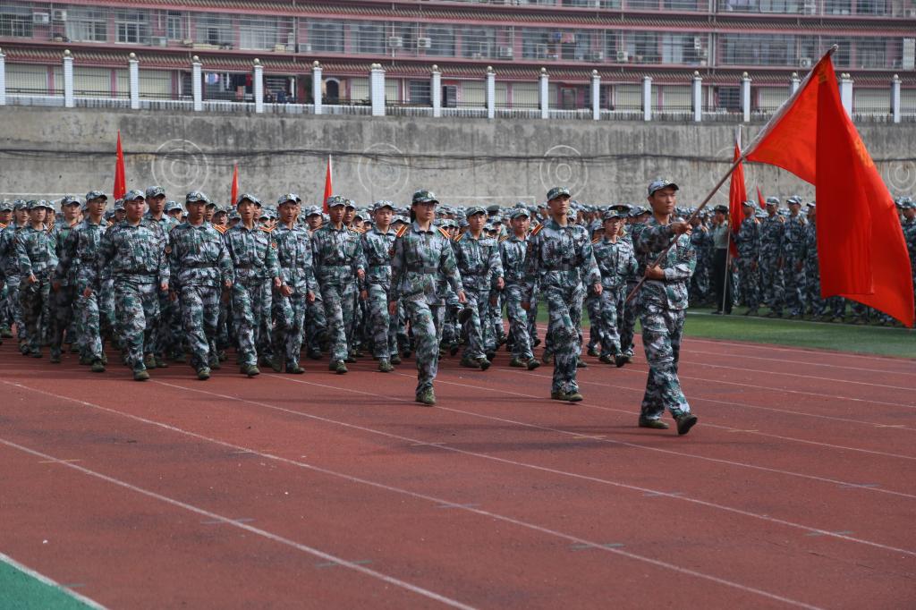 田径场上迷彩林立,列队整齐,郭军走到队列中间对各方阵进行检阅并向同学们致以亲切的问候。随着分列式表演的开始,各二级学院受阅方队依次通过主席台。他们坚定有力的步伐、整齐划一的动作、坚毅如铁的目光、气势如虹的口号,充分地向与会领导和观众展现了军训成果,彰显了人文科技学子朝气蓬勃的精神风貌。