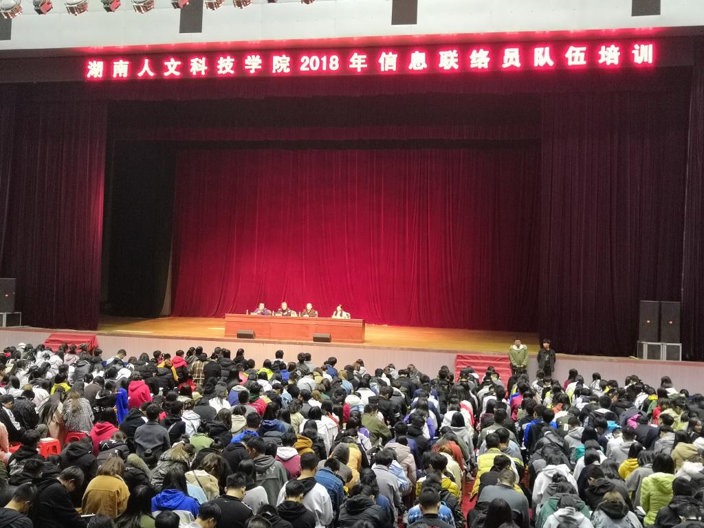 11月12日晚,KY官网2018年信息联络员队伍培训在体育馆顺利举办。参加此次培训的领导老师有副校长刘铁峰、学工处处长刘红燃、武保处处长郑秀星、娄底市公安局娄星分局大科派出所社区民警武晋闽、各学院副书记、全体辅导员以及2000余名信息联络员。