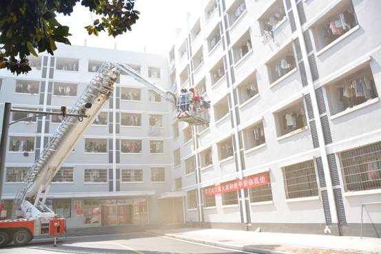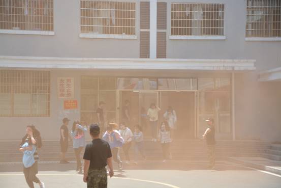 13点50分,第8栋学生宿舍楼突然冒出“滚滚浓烟”,火灾警报声骤然响起,由保卫处工作人员、二级学院辅导员、厚天消防义工团队员组成的应急疏散小组按照应急演练预定方案迅速进入到各楼层指定位置,紧急指挥学生往安全出口方向进行疏散。虽然第8栋学生宿舍结构复杂,但疏散过程紧张有序,未发生踩踏和受伤事故,短短几分钟时间,近2000名学生从安全出口撤离至应急避难场地。清点人数后,在场师生观摩了消防救援支队进行灭火演练与高空救援演练。