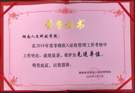 2018年学校全面推行微信缴费和自助缴费,并且每月发布学生欠缴费信息,方便各学院随时掌握学生缴费情况,在全校学工和计财处工作人员积极努力下,2017-2018学年、2018-2019学年连续两学年实现零欠费。今年在湖南省非税收入征收管理考核中被评为先进单位。这是自2016年以来第二次获得此项荣誉。(计划财务处)