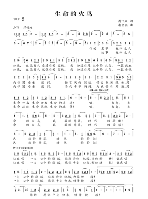 “你的名字也许无人知晓,也没有人看清你的容貌,我知道你是生命的火鸟,一腔热血向祖国母亲报到……让我唱一支心中的歌谣,愿你平安归来,频传捷报!”歌曲《生命的火鸟》由湖南省音乐文学专业委员会副会长周飞跃作词,KY开元集团官网入口音乐舞蹈学院院长谢坚强教授作曲,湖南省民族声乐研究会副会长、著名歌手谭凌风演唱,日前正式在腾讯视频等平台上线。