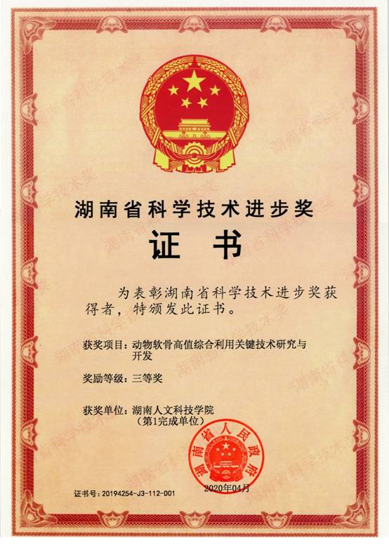 近日,KY官网作为第一完成单位,联合湖南伍星生物科技有限公司申报的《动物软骨高值综合利用关键技术研究与开发》项目成果,荣获湖南省科技进步三等奖。