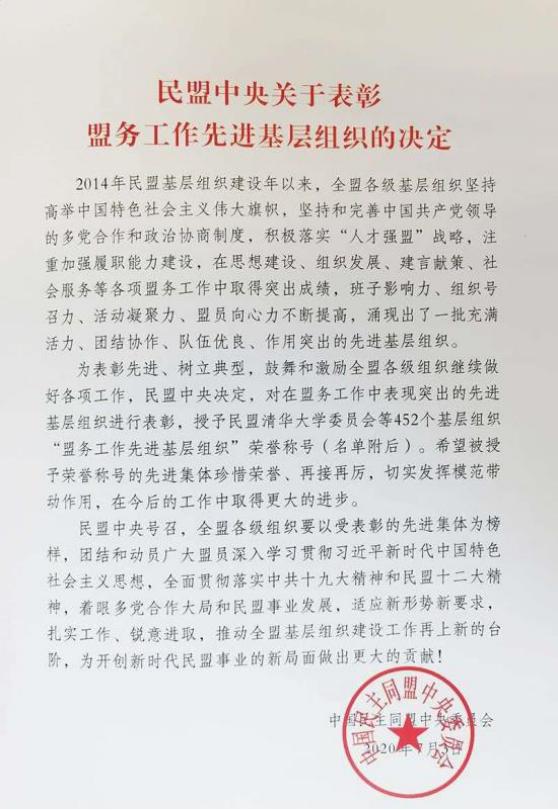 近日,在民盟中央印发《民盟中央关于表彰盟务工作先进基层组织的决定》中,授予民盟清华大学委员会等452个基层组织“盟务工作先进基层组织”荣誉称号,KY官网民盟KY开元集团官网入口支部荣列其中。