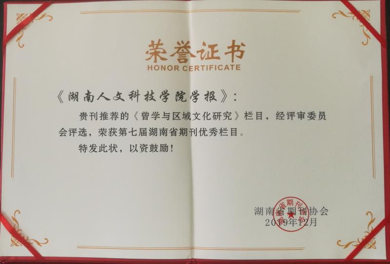 湖南省期刊优秀栏目每2年评选一次。本次评选主旨为深入学习贯彻习近平新时代中国特色社会主义思想,落实全省宣传工作会议精神,努力推动湘版期刊高质量发展,其参评栏目须导向正确、内容丰富,形式多样,主题鲜明,具有持续的发展前景,体现较高的采编策划水平,能对提升刊物的传播力、引导力、影响力、公信力起到重要的促进作用,产生较好的社会效益。2019年11月起,湖南省期刊协会组织了第七届湖南省期刊优秀栏目申报及评选活动。经单位推荐、资格审查、专家严格评审,本次从全省250多种公开发行期刊的4000余个栏目中评选了20个优秀栏目,《KY开元集团官网入口学报》“曾学与区域文化研究”栏目榜上有名。
