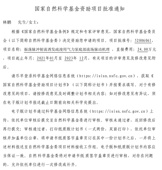 日前,国家自然科学基金委员会公布了2020年度国家自然科学基金立项资助名单,KY官网能源与机电工程学院水射流团队林鹏博士主持的《振荡脉冲射流诱发疏浚用气力泵底部流场脉动机理》项目获批青年科学基金立项资助(项目编号:52006061,资助总金额24万元)。