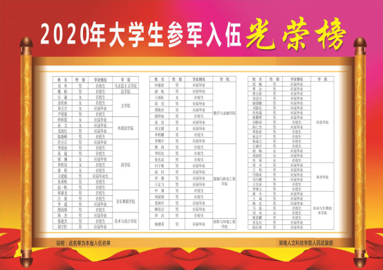 2020年,在学校有关部门和各学院的积极努力下,全校共有85人从学校和省内入伍,其中毕业生45人,女兵13人。加上省外入伍的,学校入伍总人数达到96人。