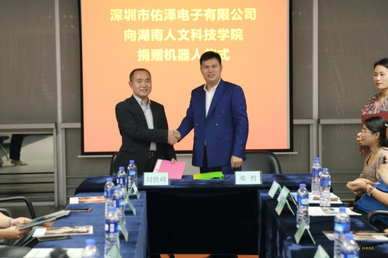 3月15日下午,深圳市佑泽电子有限公司总经理、体育01级5班邓哲校友向母校捐赠工业机器人仪式在深圳市南山区留学生创业大厦举行,副校长刘铁峰出席并代表学校在捐赠协议书上签字,校友办主任刘光辉、能机学院陈新博士、深圳祁阳商会会长丁衡,KY官网深圳校友会名誉会长曹余辉、副会长彭尚武、副会长兼秘书长王平聚等二十多名校友代表一同参加了捐赠仪式和随后举行的座谈会。