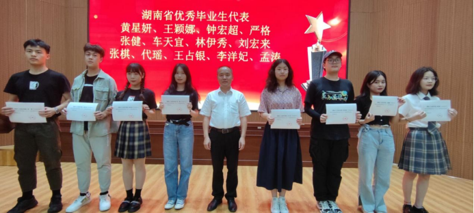 (刘铁峰副校长为省级优秀毕业生代表颁奖并与大家合影)