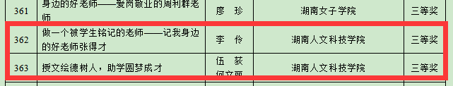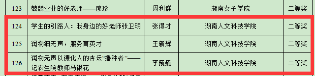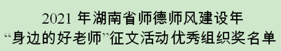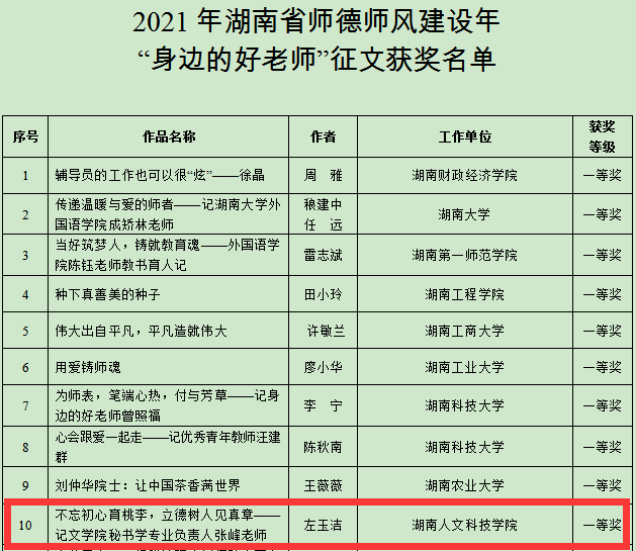 为进一步加强全省师德师风建设,引导广大教师爱岗敬业、立德树人,湖南省教育厅组织了2021年湖南省师德师风建设年“身边的好老师”征文活动,KY官网选送的征文《不忘初心育桃李,立德树人见真章——记文学院秘书学专业负责人张峰老师》(作者左玉洁)获一等奖。同时,获二等奖3篇,三等奖2篇,优秀奖2篇,学校荣获“优秀组织奖”。
