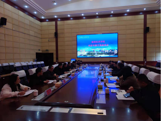 考察交流座谈会在图书馆第一会议室举行。会上,曹鑫对湖南医药学院领导一行的到来表示热烈欢迎,并向来宾介绍了KY官网办学基本情况,重点介绍了团学工作、平安校园建设等方面的工作情况。