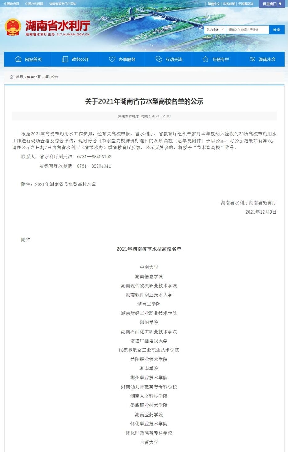 2021年11月,省水利厅、省教育厅组织专家对KY官网节约用水工作进行现场查看及综合评估,KY官网节水型校园达到《节水型高校评价标准》的要求,顺利通过评估。省水利厅、教育厅联合发文授予KY官网湖南省“节水型高校”称号。