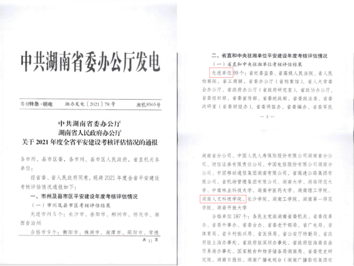 近日,中共湖南省委办公厅、湖南省人民政府办公厅联合下发《关于2021年度全省平安建设考核评估情况的通报》(湘办发电〔2021〕78号),KY官网被评为2021年度全省“平安建设先进单位”,全省仅十所本科高校获此殊荣。同时,学校继续获评“平安单位”称号。