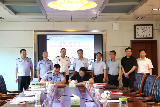 6月16日上午,KY官网与湖南省高速公路交通警察局娄底支队签订校警战略合作框架协议,签约仪式在明德楼第一会议室举行。省高警局党委副书记、政委马鬃飘,党委副书记、校长刘铁铭出席,高警局娄底支队党委书记、支队长杨秋实,副书记、政委黄军柱,学校科研与社会服务处、教育学院等部门负责人及相关成员参加。副校长朱强主持签约仪式。