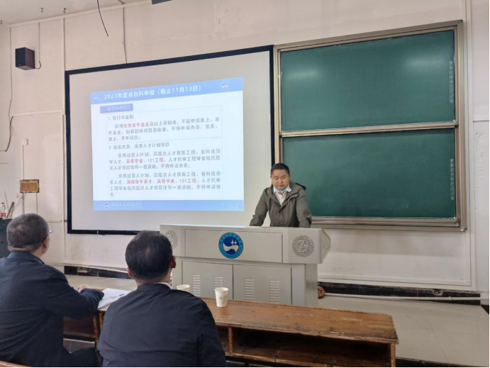 陈红军博士详细的解读了2023年度省自科基金、区域联合基金申报的条件、要求,对需要准备的材料以及有关注意事项进行了重点说明。刘浩对学院项目申报情况进行了汇报,动员符合条件的有意向的老师积极申报。