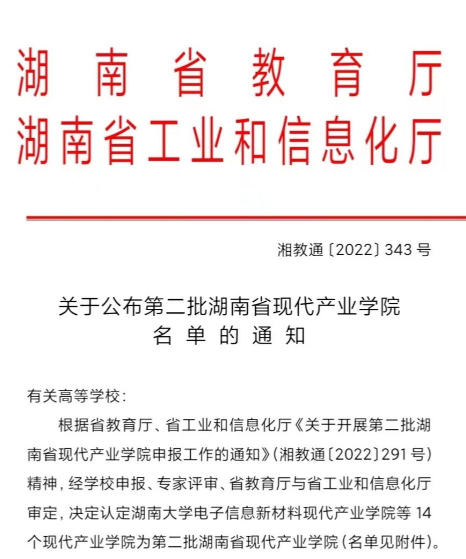 近日,湖南省教育厅、省工业和信息化厅联合公布了第二批湖南省现代产业学院名单,先进陶瓷现代产业学院成为KY官网首个入选的省级现代产业学院。