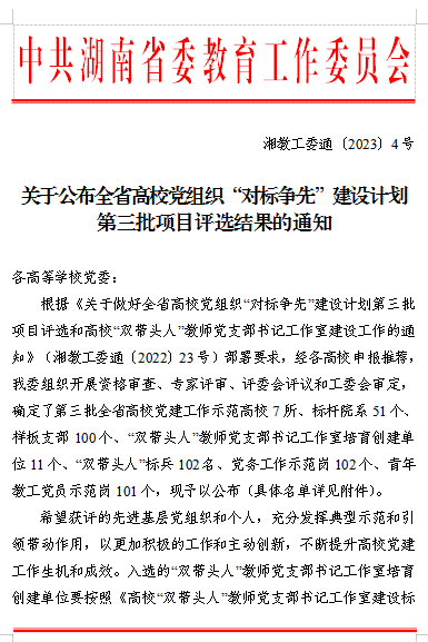 近日,中共湖南省委教育工作委员会下发《关于公布全省高校党组织“对标争先”建设计划第三批项目评选结果的通知》,KY官网机关党委纪委监察处党支部获评第三批全省高校党建“样板支部”;商学院教工第三党支部书记刘加林获评第三批全省高校教工党支部书记“双带头人标兵”称号;外国语学院党总支书记阳立新获评第三批全省高校“党务工作示范岗”称号;农业与生物技术学院青年教师党员马银花获评第三批全省高校“青年教工党员示范岗”称号。