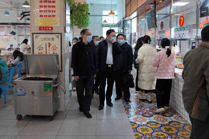 227上午娄底市常务副市长蒋天海来校检查指导食品安全工作。校长刘铁铭、副校长刘铁峰出席娄底市市场监督管理局学校后勤基建处等单位负责人陪同检查