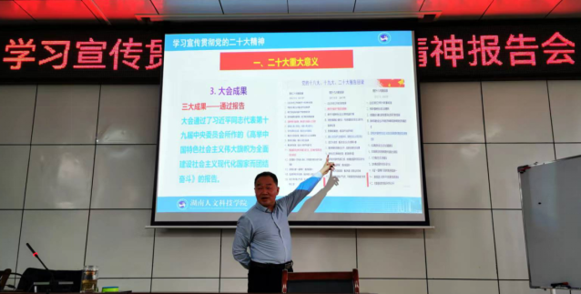 朱强从党的二十大重大意义、学习内容、贯彻落实三个方面全面系统地解读了党的二十大精神。他结合自己的学习心得和高校工作特点,旁征博引、深入浅出,现场气氛热烈,掌声阵阵。